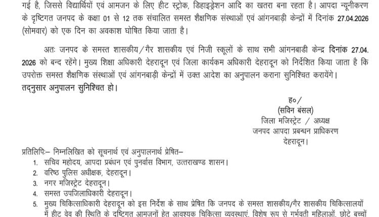 देहरादून जिले में सोमवार को भीषण गर्मी का अलर्ट, सभी स्कूल रहेंगे बंद, आदेश जारी